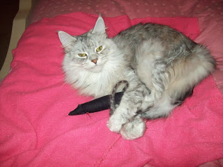 Pandora is a silver tabby Maine Coon kitty, she is a purebred kitty and her official name is Kitty Korner Princess Pandora. Pandora was born in a litter of 5 females and I picked her out special, she came to live with me at 8 weeks old, and she has been ruling the roost with an iron paw ever since.